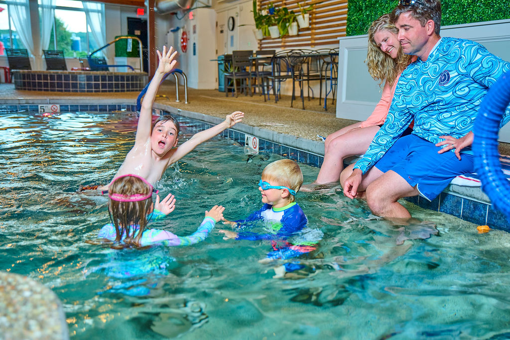 Three kids in a pool with parents watching