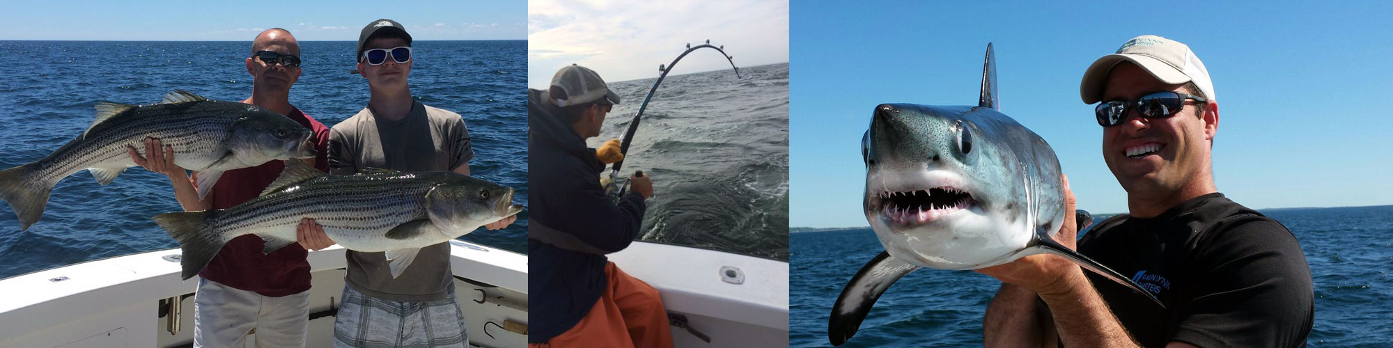 men holding a fish man with a rod with fish on and man holding shark