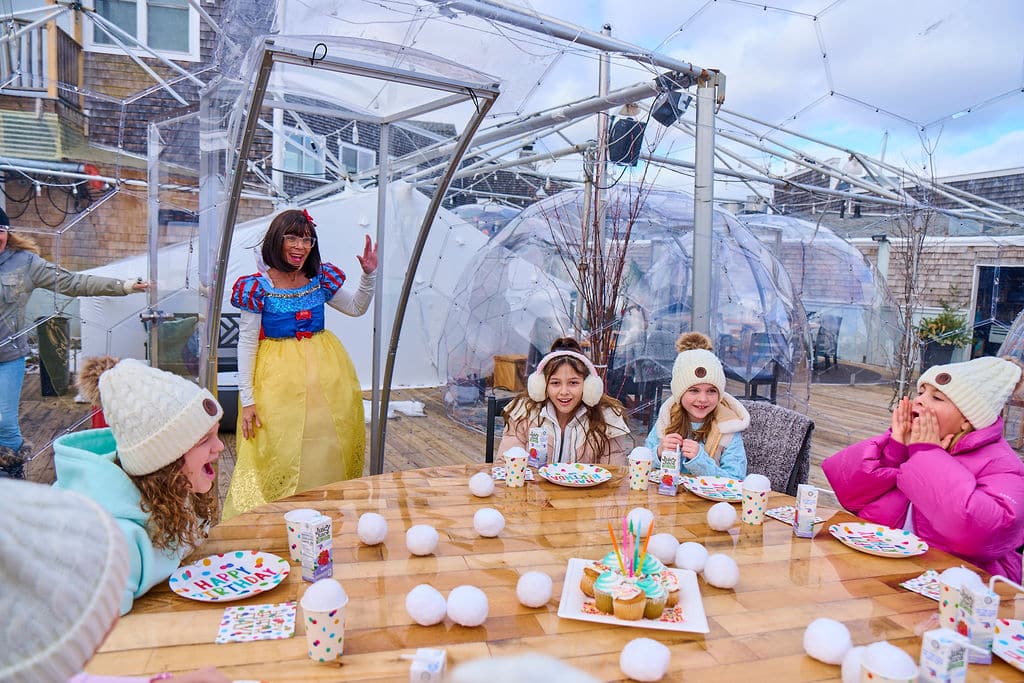 When COVID set in we starting building our own totally custom igloo dining igloos, using basic pvc, real doors and then our boatyard crew from the marina shrinkwrapped them! We elevated our Igloos to a totally clear dome where you can see the stars, the moon and even when the snow falls or the winds blow, you are toasty in these temperature controlled domes and enjoying a totally unique experience. They are located on our popular summer Bridge Deck with magical views from November to April.